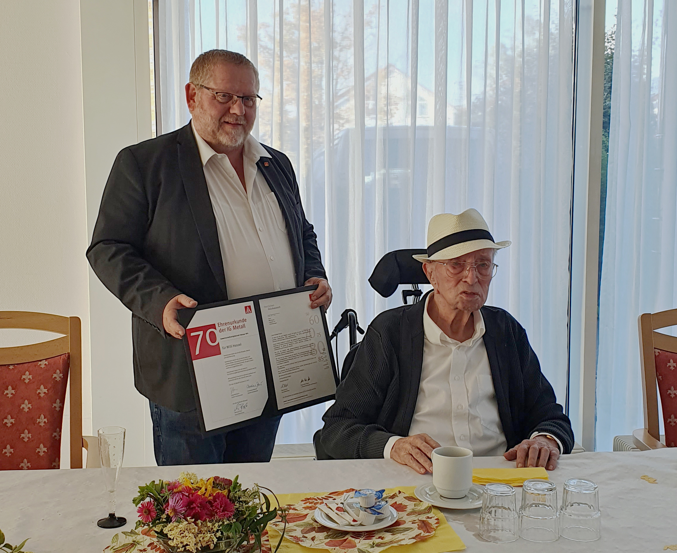 Gleichzeitig wurde der Kollege Hassel von Michael Föst, dem 1. Bevollmächtigten der IG Metall Albstadt, für seine 70jährige Mitgliedschaft in der IG Metall geehrt.