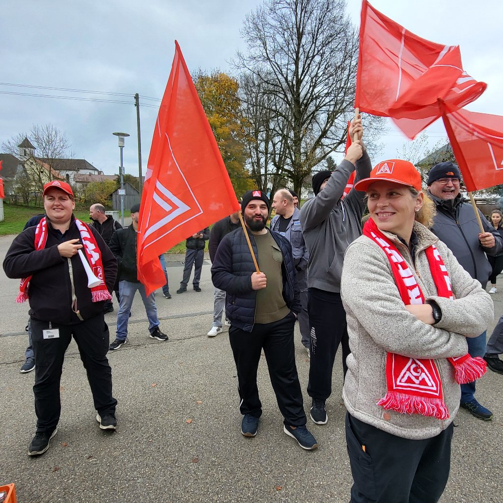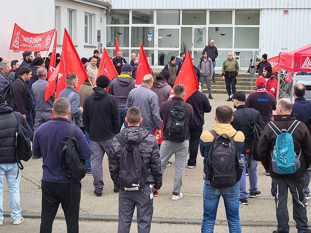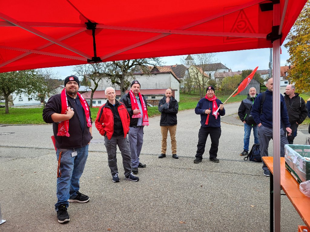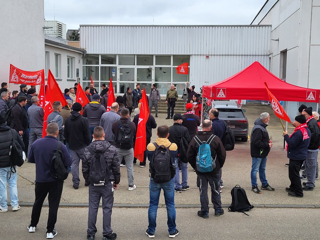 Timo Münsch, Mitglied der Delegiertenversammlung IGM Albstadt und Betriebsratsvorsitzender, war von seinen Kolleginnen und Kollegen umringt, als er unterstrich, dass sich alle ein ernstzunehmendes und wertschätzendes Angebot der Arbeitgeber erwarten. Solidarisch werden wir dies weiter einfordern! Da waren sich am 06.11.2024 auch die Beschäftigten in Leibertingen bei Mahle einig.