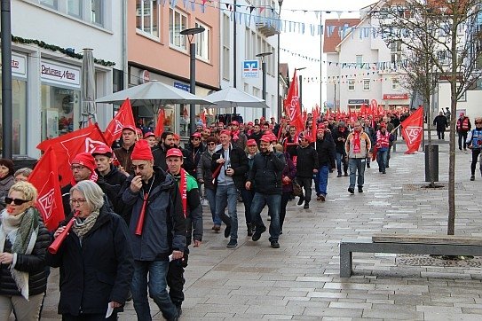 Der Menschenzug war nicht zu übersehen - und auch nicht zu überhören. Rund 800 Mitglieder der IG Metall aus dem gesamten Zollernalbkreis und den Landkreisen Tuttlingen und Sigmaringen legten die Arbeit nieder und zogen durch die Ebinger Innenstadt. Eine Kundgebung fand anschließend in der randvollen Festhalle statt.