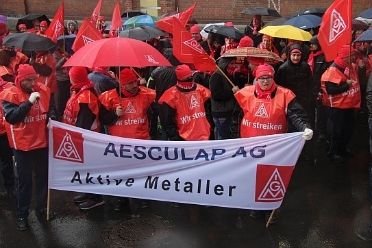 Rund 600 Mitarbeiter des Tuttlinger Unternehmens Aesculap sind heute morgen bei strömendem Regen dem Aufruf des IG Metall zum Warnstreik gefolgt.