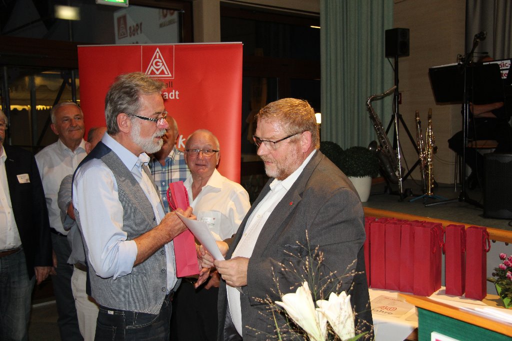 Entwicklung in der Region und macht darauf aufmerksam, dass einige der Jubilare nicht nur bei der IG Metall Mitglied geworden waren, sondern in der Gewerkschaft Textil und Bekleidung (GTB) und der Gewerkschaft Holz und Kunststoff (GHK).