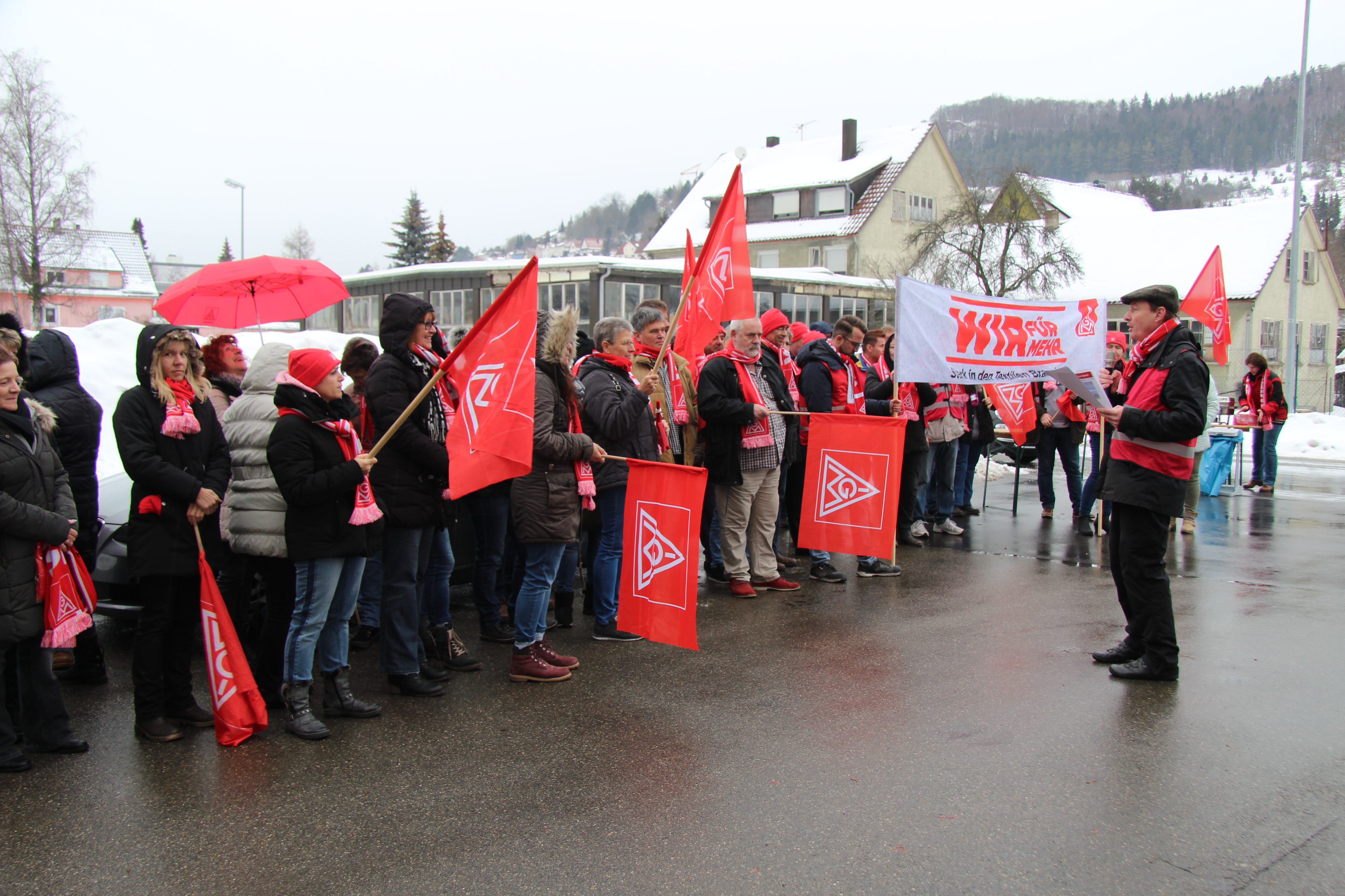 Georg Faigle, Gewerkschaftssekretär der IG Metall Albstadt, machte auf der Kundgebung klar, dass die angebotene Entgelterhöhung nicht annehmbar sei. Bei einer Inflationsrate von ca. 2 % stelle dieses Angebot noch nicht einmal eine Reallohnsicherung dar. Letztendlich, so Faigle, muss die Textilindustrie auch aus Eigennutz dafür Sorge tragen, dass die Branche attraktiv bleibt. Viele Beschäftigte in der Textilindustrie so Faigle, werden in den nächsten Jahren in Rente gehen und somit sind attraktive Entgelte eine Grundvoraussetzung, dass dieser Generationswechsel gelingen kann.