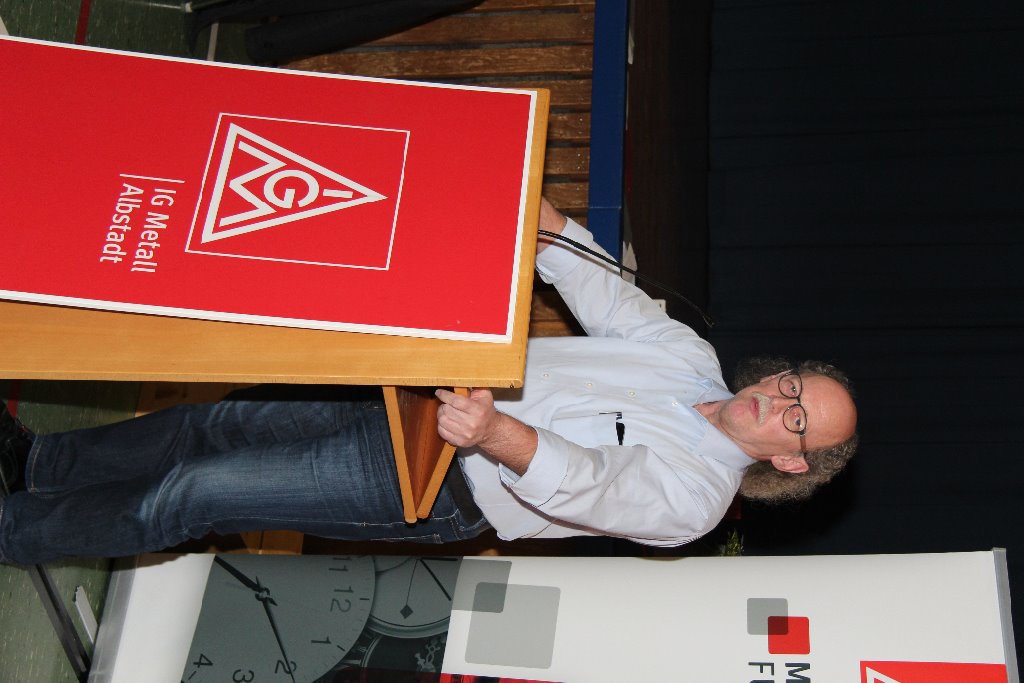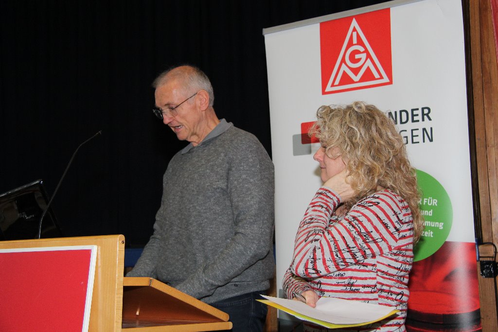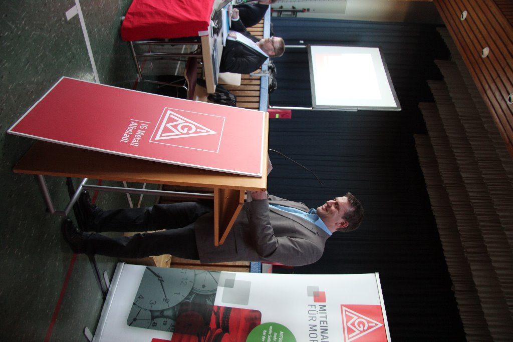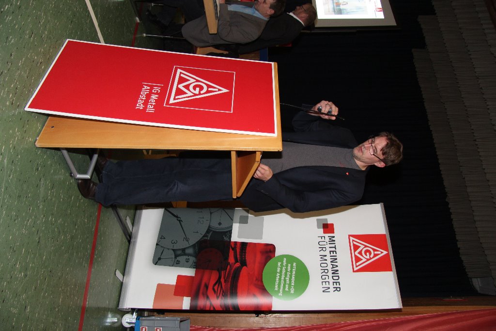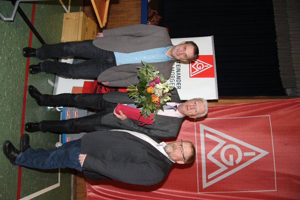 Zum Schluss der Veranstaltung verabschiedete Michael Föst den Gewerkschaftssekretär Georg Faigle. Nach über 13 Jahren aktiver Tätigkeit bei der IG Metall Geschäftsstelle Albstadt, wechselt Georg Faigle nun zum 1. März in die Geschäftsstelle Freudenstadt. Michael Föst bedankte sich für sein Engagement und seinen Einsatz. "Georg Faigle ist ein guter Gewerkschafter mit einem heißen Herz, einem kühlen Kopf und immer bereit einzuschreiten wenn es darum geht, Ungerechtigkeiten in der Arbeitswelt zu beenden."