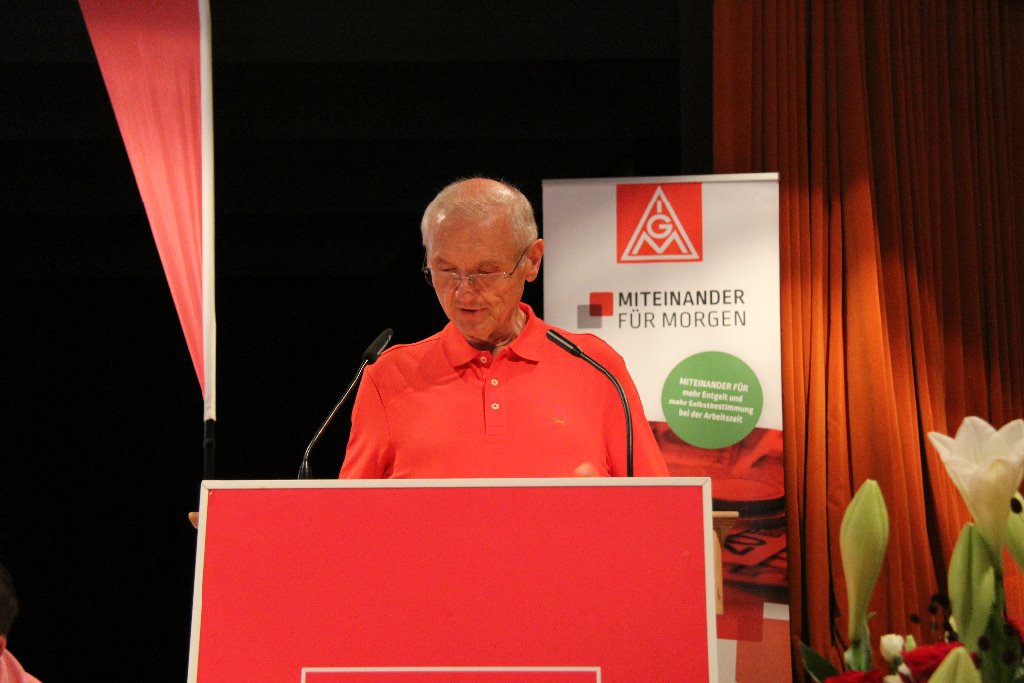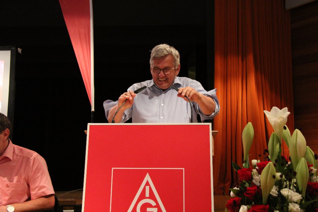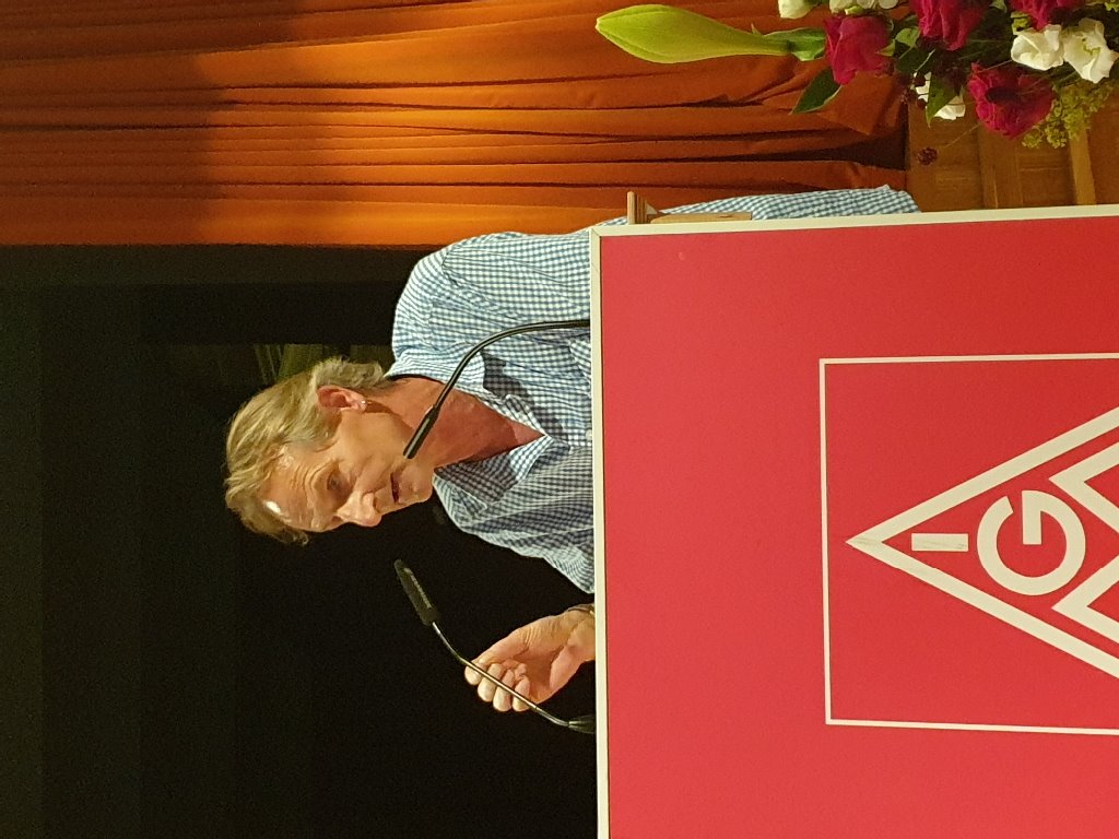 Die Forderung an Arbeitgeber und Politik, dafür zu sorgen, dass der ökologische und digitale Wandel nicht massenhaft Verlierer hervorbringt. Im Gegenteil: Die Transformation soll aus technischem Fortschritt sozialen Fortschritt machen. Das setzt voraus, dass für Beschäftigte Brücken gebaut werden. Jörg Hofmann führte in seiner Rede weiter aus, dass die IG Metall ein Transformationskurzarbeitergeld verlange. Damit werden Entlassungen vermieden und die Beschäftigten können sich für die Arbeit an neuen Produkten qualifizieren.