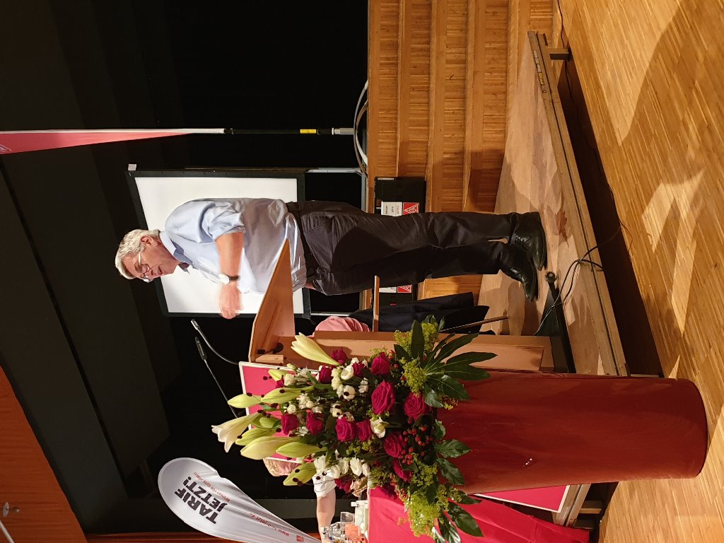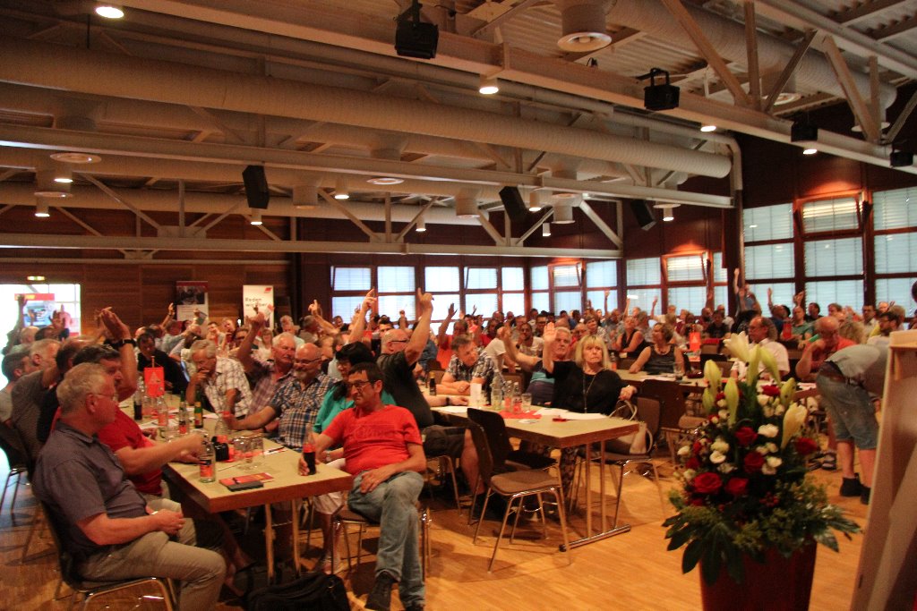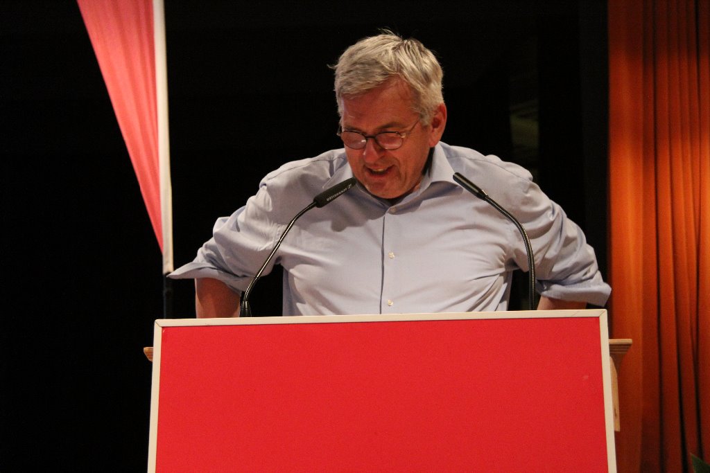 Im Anschluss an die Betriebsbesichtigung ging es weiter in die Geschäftsstelle zu einer Pressekonferenz, in der Jörg Hofmann sich den Fragen der Journalisten vor Ort stellte. Als letzte Station sprach Jörg Hofmann vor über 200 Funktionären der IG Metall Albstadt in der Festhalle in Fridingen an der Donau. Er ging nochmals darauf ein, dass die Demonstration in Berlin mit über 50.000 Menschen aus ganz Deutschland ein wichtiges Zeichen für die Forderung an Arbeitgeber und Politik sind dafür zu sorgen, dass der ökologische und digitale Wandel nicht massenhaft Verlierer hervorbringt. Aus Albstadt fuhren sechs Busse mit 240 Teilnehmern auf die Kundgebung in Berlin.