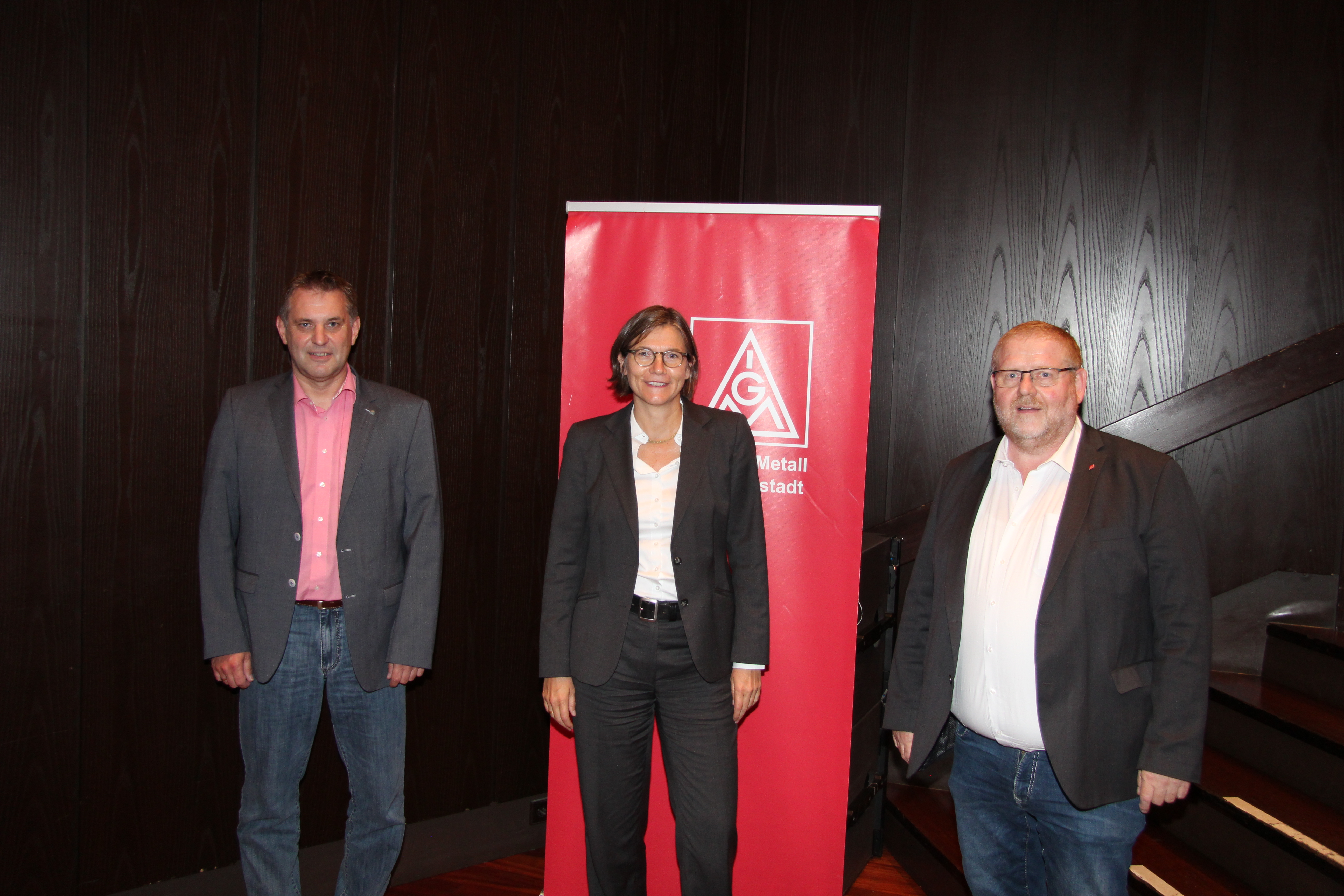 Christiane Benner sprach vor über 90 Delegierten der IG Metall Albstadt. Aufgrund der Corona-Richtlinien war es nicht möglich, mehr Funktionäre zu dieser Veranstaltung einzuladen. Christiane Benner gratulierte auch dem Ortsvorstand zu ihrer Wahl. Zu Beginn ihrer Rede ging sie auf die aktuelle Situation mit Corona und Kurzarbeit ein und bedankte sich bei den anwesenden Delegierten für das schnelle und gute handeln der Mitglieder. Sie betonte aber gleichzeitig, dass diese Krise nicht vergleichbar mit der aus 2008 / 2009 sei. Dies mache schon die Zahl der sich in Kurzarbeit befindenden Beschäftigten bemerkbar. In 2009 betrugt der Höchststand ca. 1,9 Mio. so waren es 2020 bereits über 10 Mio. Menschen die sich in Kurzarbeit befanden. Diese Zahl macht deutlich, dass es weiteren Handlungsbedarf benötigt um hier die Beschäftigten vor drohendem Arbeitsplatzverlust zu schützen. Für die IG Metall steht fest oberste Priorität hat nun die Sicherung der Beschäftigung. Einen Stellenabbau im großen Stil wird es mit der IG Metall nicht geben. Wir stehen vor großen Herausforderungen und es gilt nun die Zukunft mitzugestalten, die Digitalisierung und die Transformation stellen die Betriebe vor große Aufgaben, hierzu bedarf es gut qualifizierten und motivierten Mitarbeitern-innen. Jetzt mit Arbeitsplatzabbau zu kommen sei der falsche Weg die vorhandenen Möglichkeiten müssen ausgeschöpft werden. Es gilt die Beschäftigten zu qualifizieren und in nachhaltige neue Produkte zu investieren.